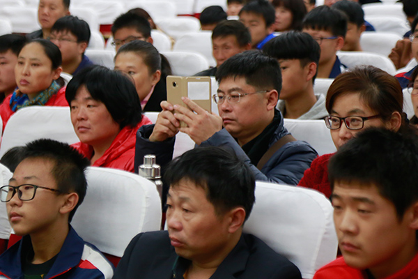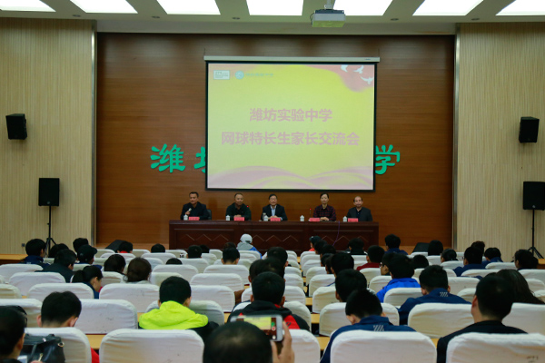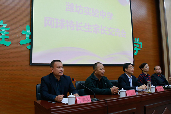 11月5日,我校网球特长生家长交流会在明德楼报告厅举行。我校校长、中国中学生体育协会网球分会副秘书长刘树忠,潍坊市网球协会副会长李玲,北京师范大学王力晨教授以及嘉瑞德能源科技股份有限公司总经理缑一兵出席活动,家长交流会由副校长、学生成长中心主任丁春和主持。