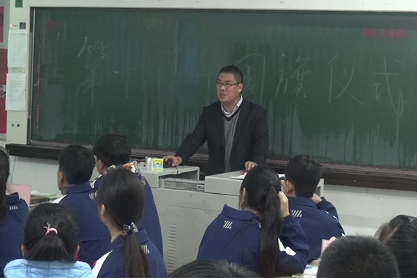 在班级内庄严的国旗下,同学们全体起立,唱国歌,行注目礼