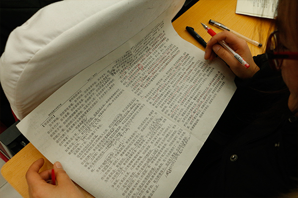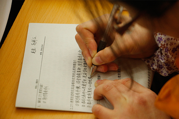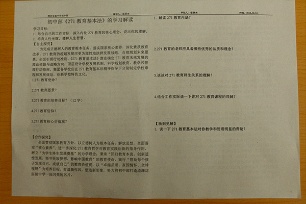 会上,初中部全体教师先结合《271教育基本法》文本材料自主学习10分钟,然后在小组内合作探究、讨论,达成共识,碰撞思想,最后将生成的智慧展示在学案上。